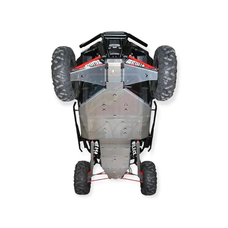Cette protection intégrale en aluminium de 5mm permettra de protéger efficacement le dessous de votre machine lors de vos sorties tout terrain Le kit se compose d'une protection centrale, d'une paire de protections de triangles avant, une paire de protection de triangles arrière et la visserie nécessaire au montage Le montage s'effectue sans modifications, montage simple Composition : Aluminium - Ligue 5754 - Traitement T5 Caractéristiques : Plaques épaisseur 5 mm
