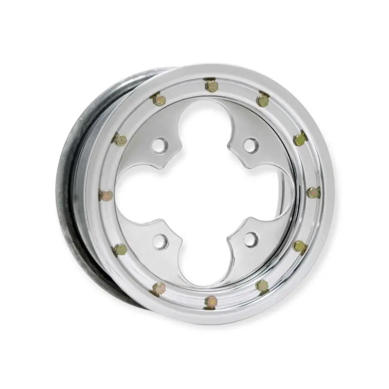 Le must de la jante, équipée d'une frete extérieur boulonnée et d'un centre taillé dans la masse. Ce modèle requiert des écrous coniques. Dimensions: 10x8 4x110 3+5. Article DOUGLAS WHEELS