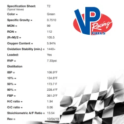 Le VP T2 est parfait pour les moteurs 2T, d'origine ou modifiés, et peut être optimisé avec des réglages d’allumage et de richesse. Stockez-le au frais et utilisez-le froid dans un réservoir plein pour des performances maximales.