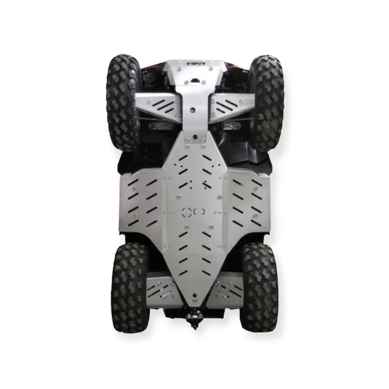Cette protection intégrale en aluminium de 5mm permettra de protéger efficacement le dessous de votre machine lors de vos sorties tout terrain Le kit se compose d'une protection centrale, d'une paire de protections de triangles avant, une paire de protection de triangles arrière et la visserie nécessaire au montage Le montage s'effectue sans modifications, montage simple Composition : Aluminium - Ligue 5754 - Traitement T5 Caractéristiques : Plaques épaisseur 5 mm